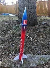 The heaviest rockets are usually the most durable. They are also the simplest in design. Usually 12-16 inches in height, they are made from 2-3 pages of newsprint rolled into a tube, taped securely, then covered in a layer of duct tape. The fins are made of cardboard from cereal boxes. Other rockets are made from printed patterns on paper that’s a bit heavier than standard printer paper. I also use a light cardstock. The cardstock is saved for the rockets that are fancy, and the ones that are replicas of real spacecraft. The patterns for these are also located online.